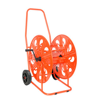 De slangwagen is gemaakt van staal en is voorzien van een rode laklaag.